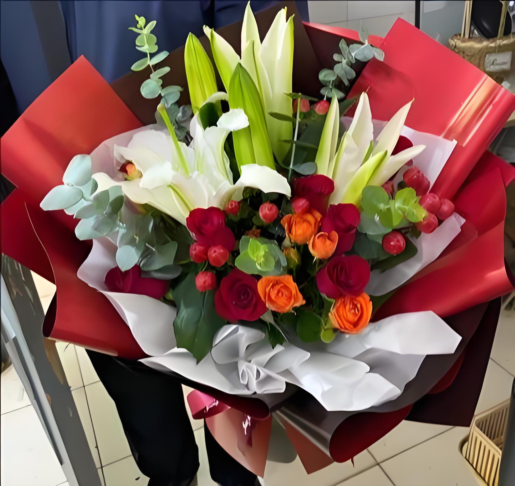 淮南田家庵区花店包11枝红玫瑰、2枝多头白百合、6枝橙色多头玫瑰、红豆、尤加利叶